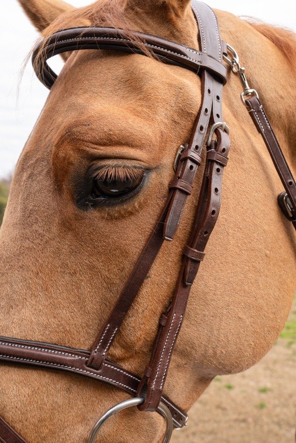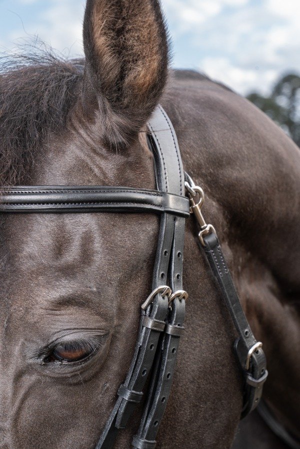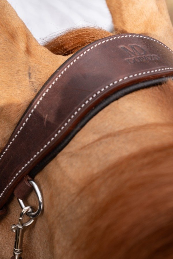 Cabezada de cuero premium para salto. Con testera ancha y plantillado en muserola y frentera. Ahogadero con mosquetón para una colocación más fácil y rápida.