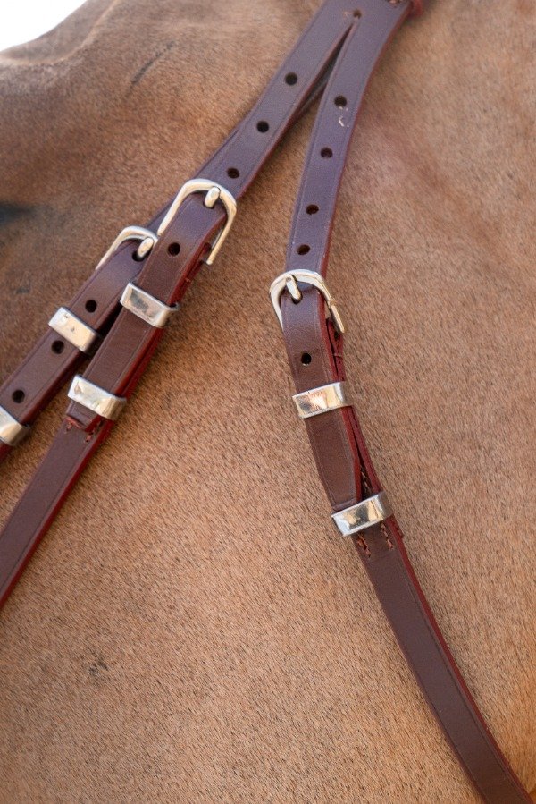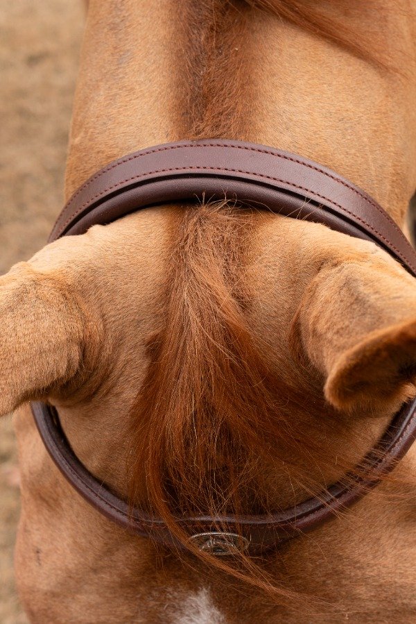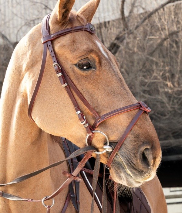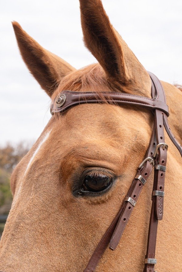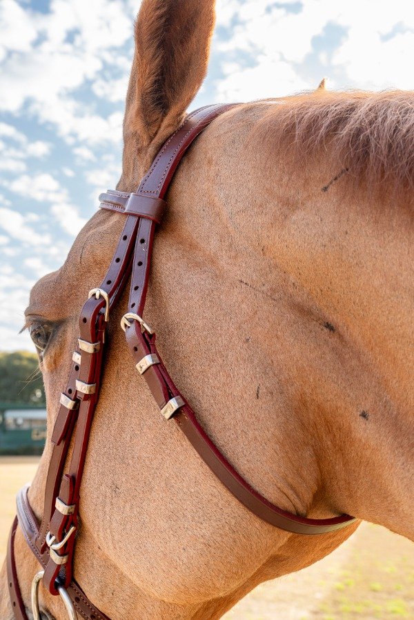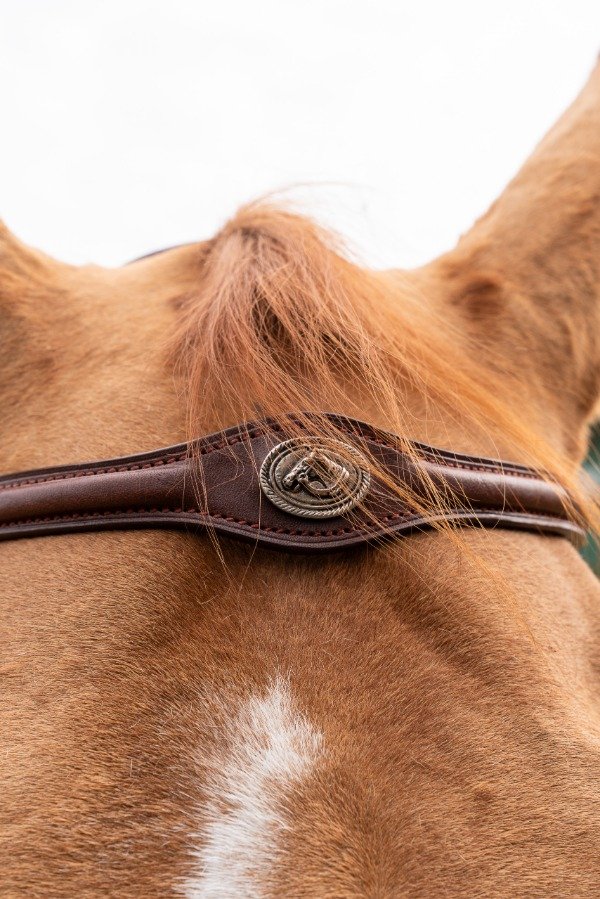 Cabezada de cuero para salto. Con cierra boca. Tiene detalles en acero que logran destacar la cabeza del caballo.
