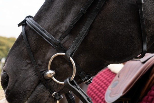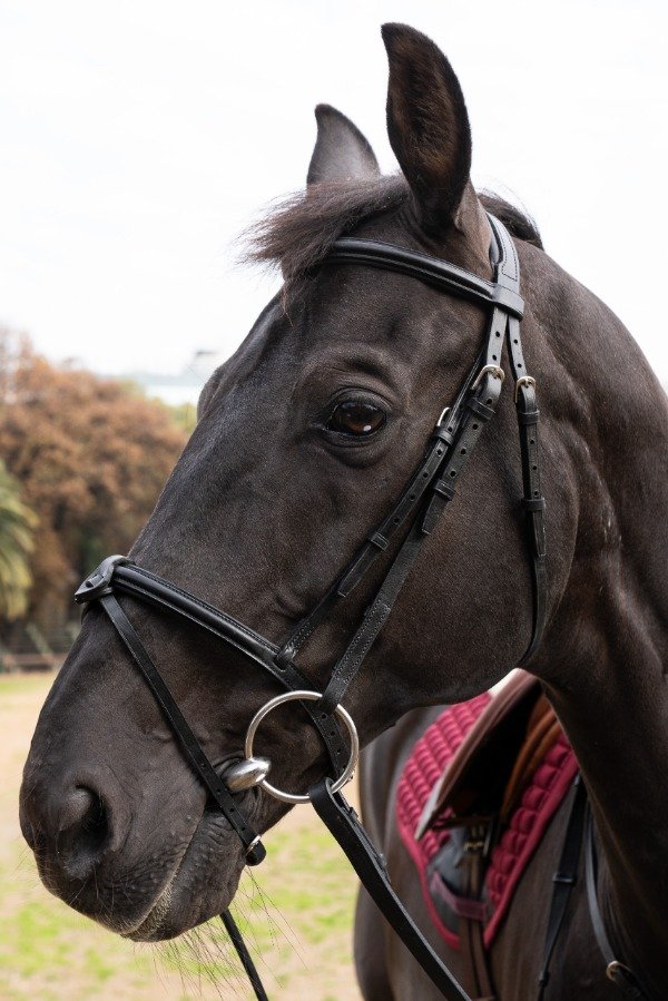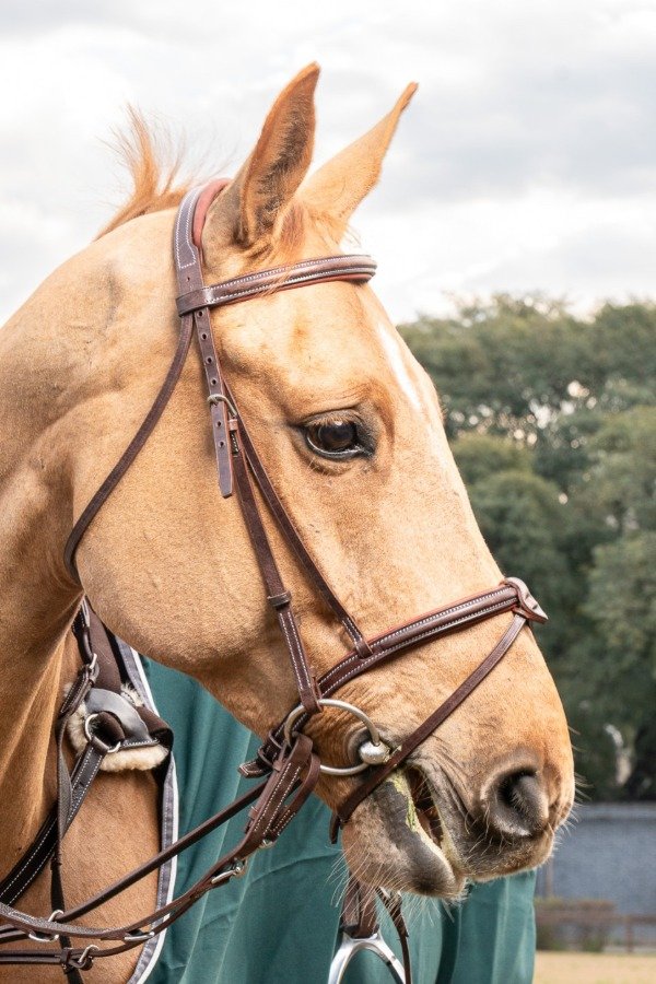 Cabezada de cuero para salto. Con cierra boca. Tiene plantillado en la frentera y muserola, para mayor comodidad del caballo.