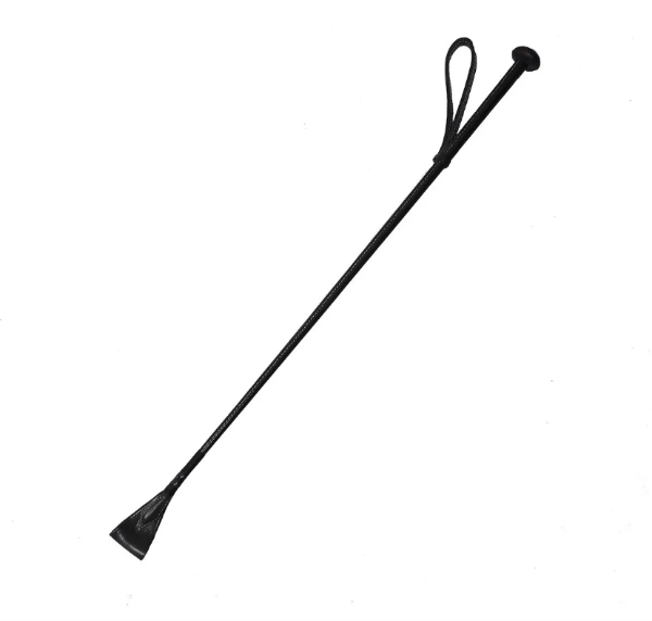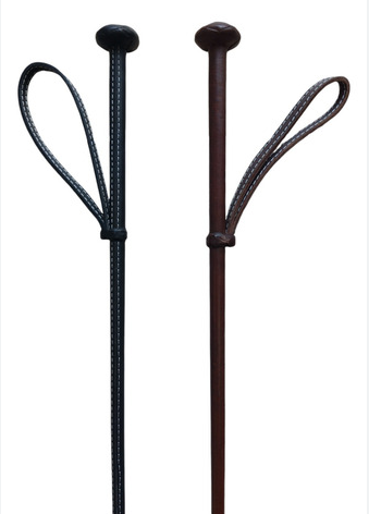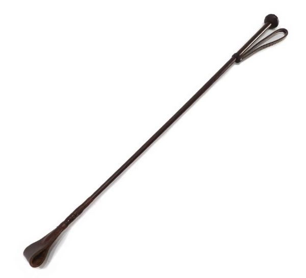 Fusta forrada en cuero, grip de cuero y terminación con tope en forma de hongo.