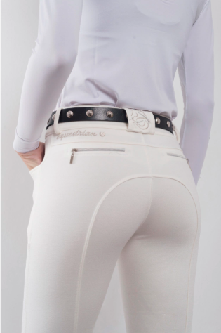 Descubre el Breech Quidam blanco, un modelo diseñado especialmente para usar en competencias, confeccionado con tela importada de excelente calidad que asegura tanto durabilidad como comodidad en cada uso. Este breech cuenta con un half grip de silicona con un atractivo diseño de tribales, ofreciendo un agarre excepcional y un toque moderno.