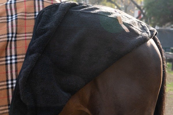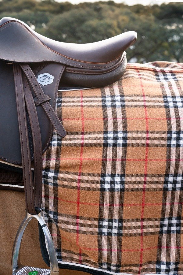Manta Riñonera Caballos Burberry. Fabricada con tela tipo Burberry por fuera y corderito por dentro. Tiene un agarre con velcro a la montura y un colero, logrando que no moleste ni se mueva con los movimientos del caballo. Tamaño: full. Apto para caballos grandes y medianos.
