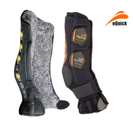 Su forma perfecta evita que se deslicen y ofrecen protección adicional en la parte inferior. Son la mejor y más rápida solución en comparación con las fijaciones tradicionales. Los orificios de ventilación impiden una recirculación de aire eficaz. Los protectores de cuadra eQuick aero-magneto son cómodos y están fabricados con materiales de calidad, un producto reconocido y apreciado por jinetes de élite, pero también por aficionados que buscan lo mejor para sus caballos.