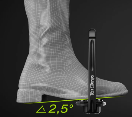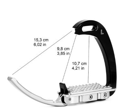 Estribos de seguridad Tech Stirrups. Mecanismo único que permite que el pie se suelte en caso de necesidad con una fuerza mínima hacia la parte móvil.