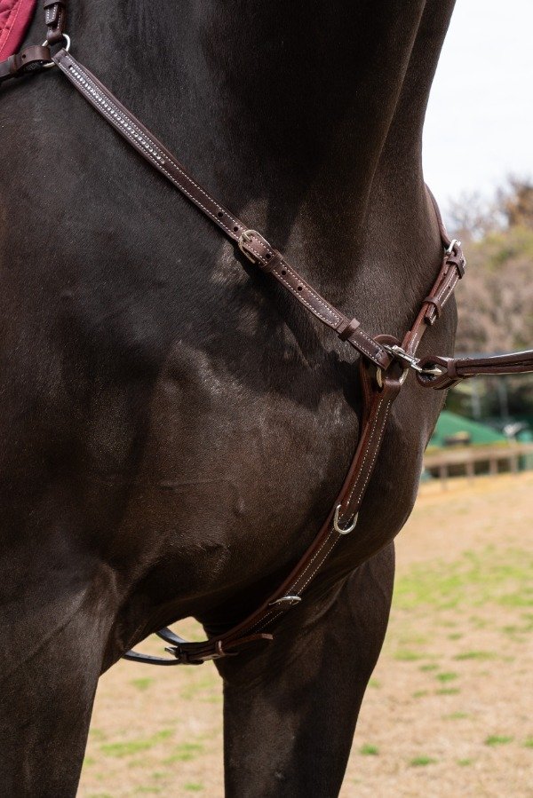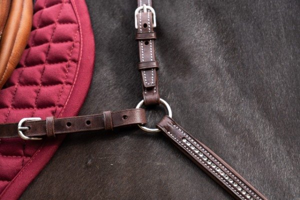 Incluye martingala. Este pretal tiene unos apliques de strass, tiene 3 puntos de agarre hacia la cincha. También tiene elástico para lograr que el caballo entrene o salte con mayor comodidad. Esta fabricado y forrado con el mejor cuero, y posee hebillas para colocar arneses, bajadores o martingalas en diferentes puntos del pecho.