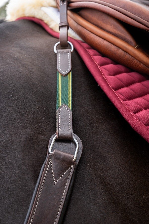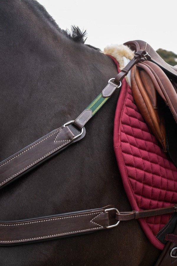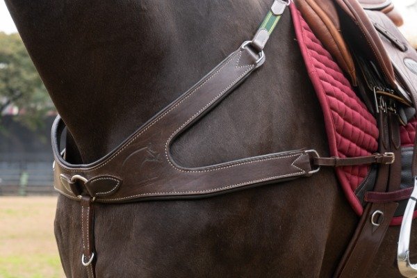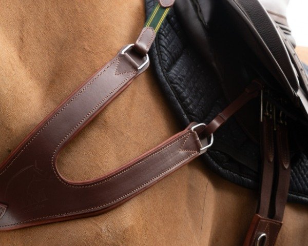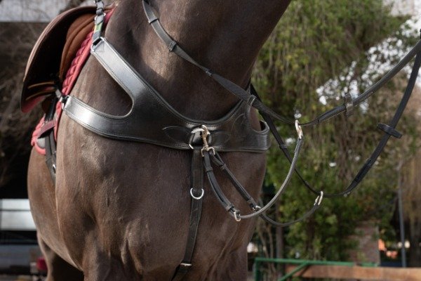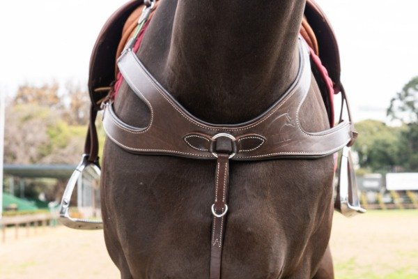 Incluye Martingala. Pretal diseñado por el jinete Leo Moschini, fabricado con cuero premium forrado, ancho en la parte del pecho y elástico. Posee hebillas para colocar arneses, martingalas o bajadores en diferentes puntos.