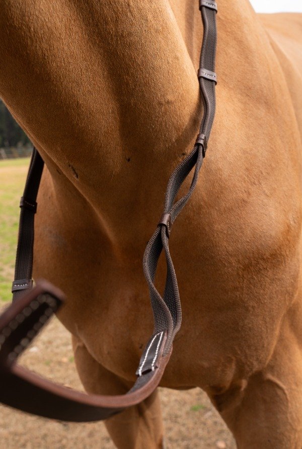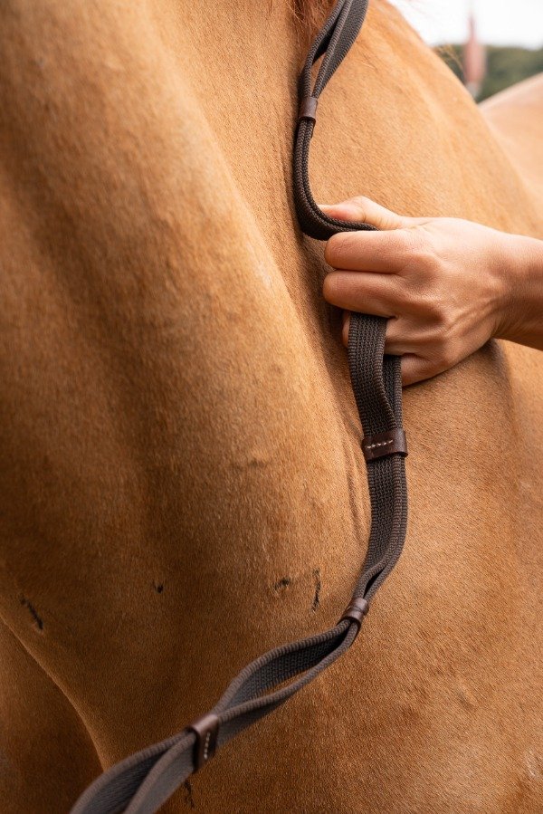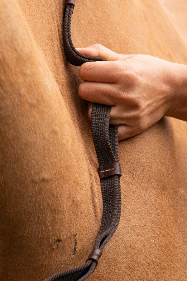 Riendas fabricadas con galón engomado, que permiten un mayor agarre y comodidad. Al ser doble permite sujetar la rienda usando los topes para fijar la misma.