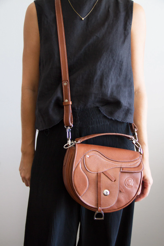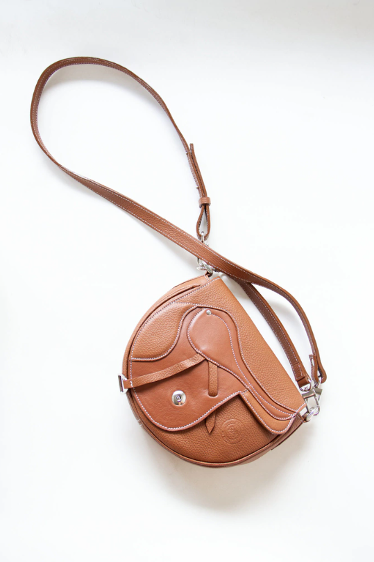 Carteras de cuero en forma de monturas. Incluye tira para colgar más larga.